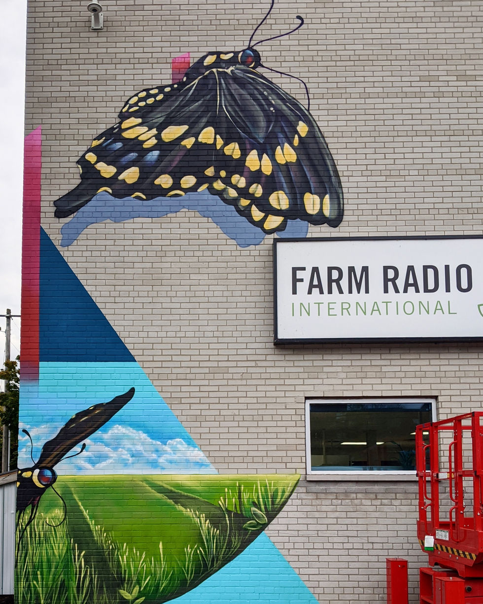This mural was commissioned in Ottawa by World University Services of Canada for the building they share with Farm Radio International in Fall 2023. A mural about education empowering change in the rural developing world.