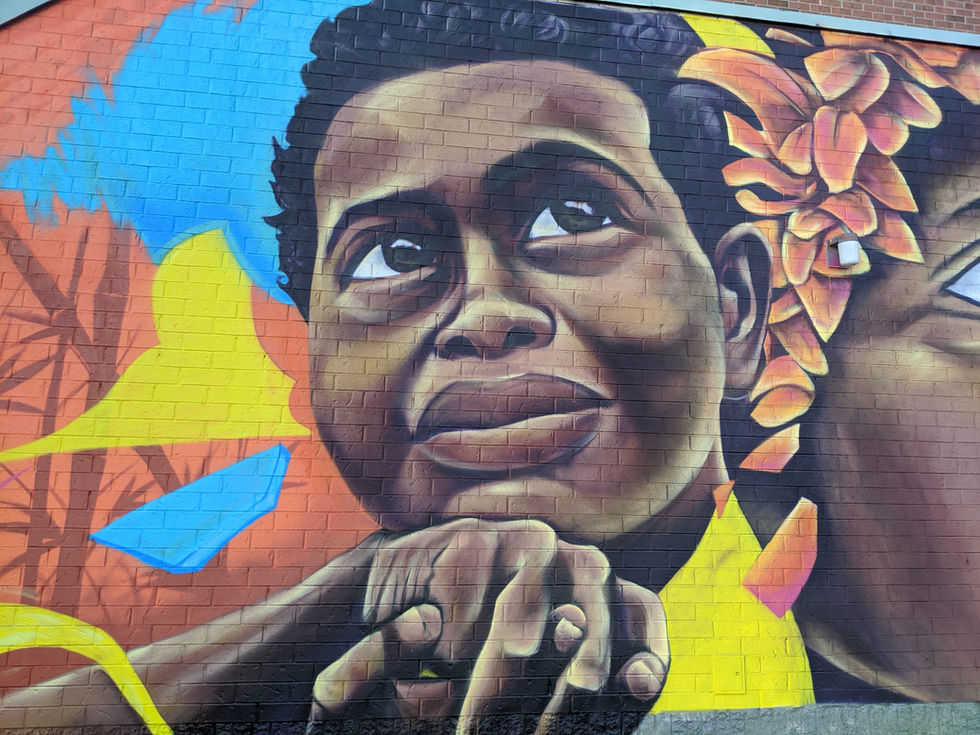 A mural depicting the smiling faces of two Negritos of the Malay Peninsula. Also known as the Semang, they are an indigenous group inhabiting the northern part of the peninsula and are generally characterized by their short stature, dark skin, and frizzy hair, which share similarities with other Negrito populations in Southeast Asia and certain indigenous African tribes. Painted in Ottawa's Chinatown in 2020.